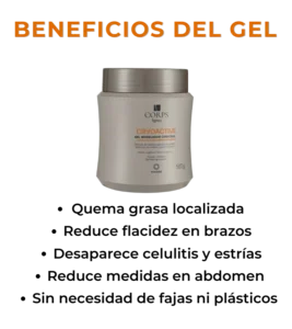 Gel Modelador Corps, reduce tallas, elimina grasa localizada y mejora la firmeza de tu piel. Dile adiós a la celulitis y la flacidez con su efecto reafirmante y tonificante. ✨
